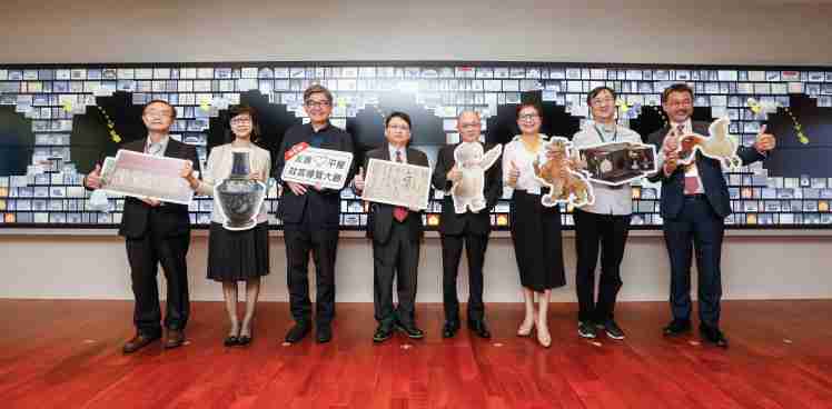 Wepay携手创利空间为故宫建置的智慧文物互动导览墙及轮播墙,,今日正式启用。。。。(左四:Wepay新事业暨投资管理总部副总经理杨本豫、、、、右四:故宫博物院院长吴密察、、、、右三:太极影音董事长黄宝云)